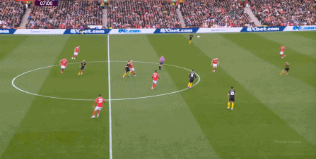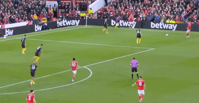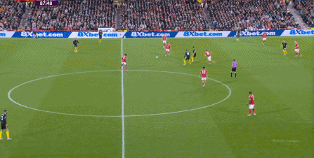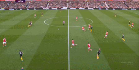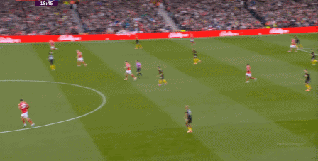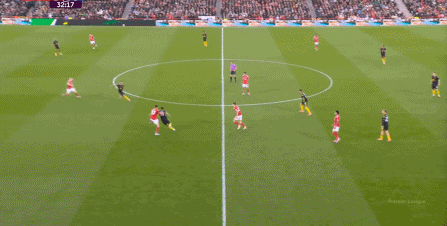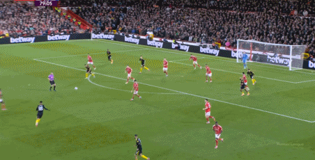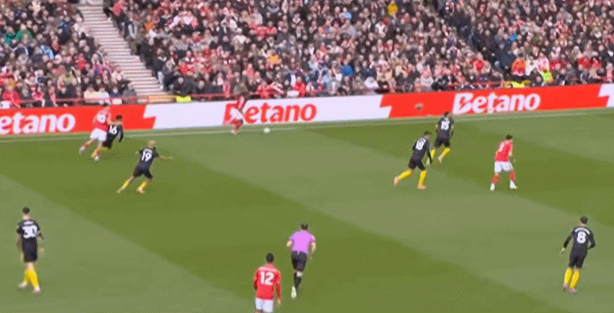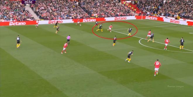 在這之后,才是諾丁漢森林的施壓,迫使曼聯(lián)兩個邊鋒全部深度落位: