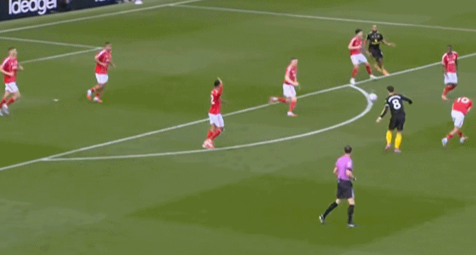 接下來諾丁漢森林稍作變化,在這次進攻的時候,盧克-肖和達洛特進行了換位,前者外擴為翼衛(wèi),后者代打邊中衛(wèi):